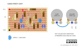 This is an early two knob Guild Foxey Lady, which is very similar to a silicon Mosrite Fuzzrite. However it’s different to other schematics I have seen online -