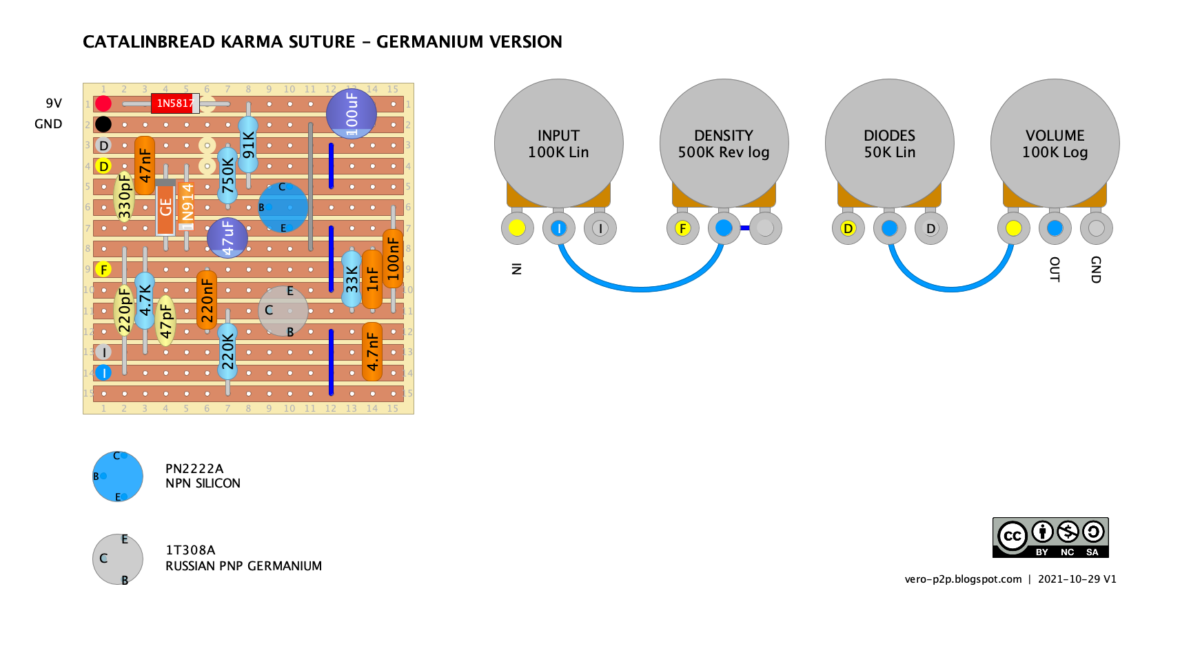 A nice Harmonic Percolator variation from Catalinbread. They've kept the bones of the original, and have added an input capacitor blend, as well as a pot to dial in the diodes on the output.